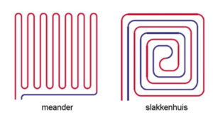 Hierboven een afbeelding van het meander patroon en slakkenhuis patroon. Het meest gekozen leg patroon is het slakkenhuis patroon, deze wordt het meest gekozen omdat de vloer met dit slakkenhuis patroon gelijkmatig warm wordt.